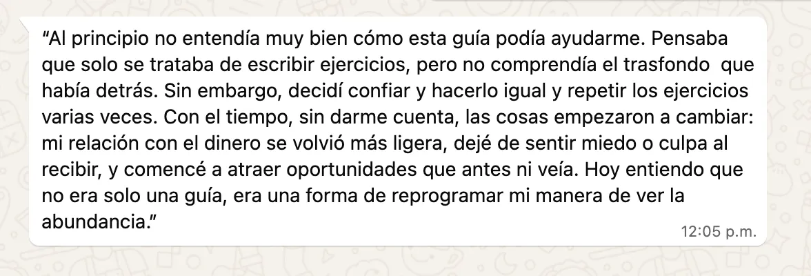 Porque no es un PDF cualquiera: es un método probado con ejercicios prácticos que te llevan a transformar tu vida en áreas concretas. Lo que inviertes equivale a menos del precio de una salida a cenar, pero el valor que obtienes impacta directamente en tu bienestar y claridad a largo plazo.